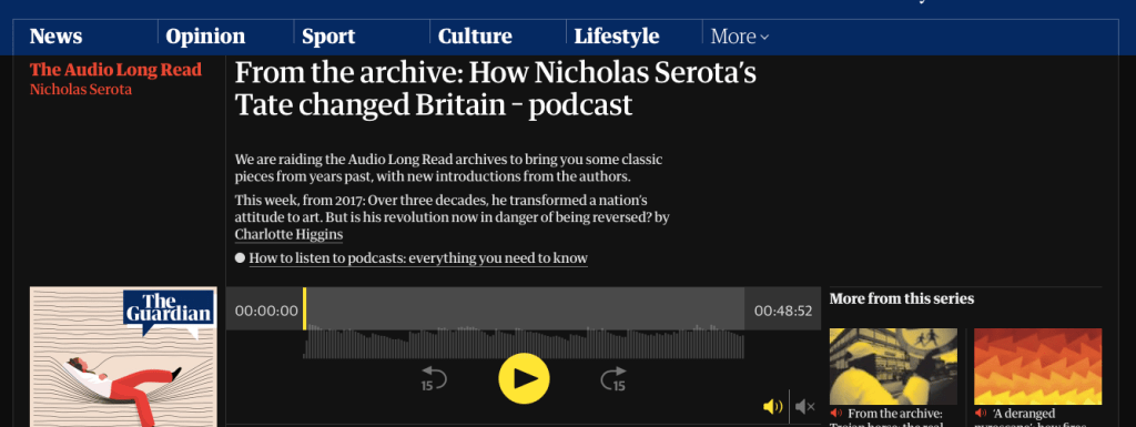 저는 팟캐스트 애호가입니다. 테크 분야에서는 월스트리트저널의 Tech News Briefing 을 자주 듣습니다. 에피소드 한 편에 15분 내외입니다. 그야말로 브리핑입니다. 훌륭한 기자는 글도 말도 쉽다는 것을 새삼 느낍니다. SBS는 그다지 좋아하는 미디어는 아니지만 골라듣는 뉴스룸 은 좋습니다. 요일별 기획, 여러 분야의 전문 스피커 초청, 에피소드의 분할과 설명도 매끄럽습니다. 특히 SBS 아나운서들이 번갈아 가며 진행하는 책소개 ‘북적북적’을 좋아합니다. <매거진 B>의 B Cast는 어떤 브랜드와 그에 대한 관점이 궁금할 때 복습하는 콘텐츠이기도 합니다. 디자인과 건축에도 조금 관심을 갖고 있는데 2013년에 에피소드가 끝난 디자인과 이슈 를 다시 찾아 듣기도 합니다. 건축가 마야 린의 베트남 참전 기념비를 다룬 32번째 에피소드는 현장의 건축 수업 처럼 생생했죠. 요즘 들으려고 ‘애쓰는’ 팟캐스트는 The Guardian의 The Long Read입니다. 특히 From the archive 라는 주간 기획을 좋아합니다. 최근에는 Tate의 전설적인 디렉터 Nicholas Serota를 집중 조명했습니다. From the archive: How Nicholas Serota’s Tate changed Britain 영국식 발음에 ‘LONG READ’ 분량이라 사실 어렵습니다. 다행인건 텍스트를 제공한다는 것. 더듬더듬이라도 이렇게 좋은 기사를 읽을 수 있다는 게 어딥니까. ‘프롬 디 아카이브’라니 제목만 봐도 듣고 싶지 않습니까. 아카이브랩과 아르노가 최근에 시작한 아카이브다 도 구독을 시작했습니다. 아카이브의 이야기가 다양한 매체를 통해 전달되면 좋겠습니다. 사실 조금 너드(nerd)같은 팟캐스트도 있는데 그건 밝히지 않을게요.