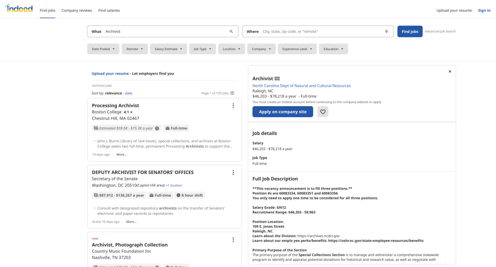 아키비스트의 업무는 어떨까? 라는 생각이 들어 indeed에서 검색을 해보았는데요. 기록을 잘 관리하고 보존하게 하는 업무들을 요구하는 것은 비슷했습니다. 전자기록이나 디지털콘텐츠의 무결성을 보장하거나 보안을 보장하는 영역이나 장기보존, 메타데이터 관리, 교육 등 아카이브에서 필수적으로 요구되는 업무들이었어요.