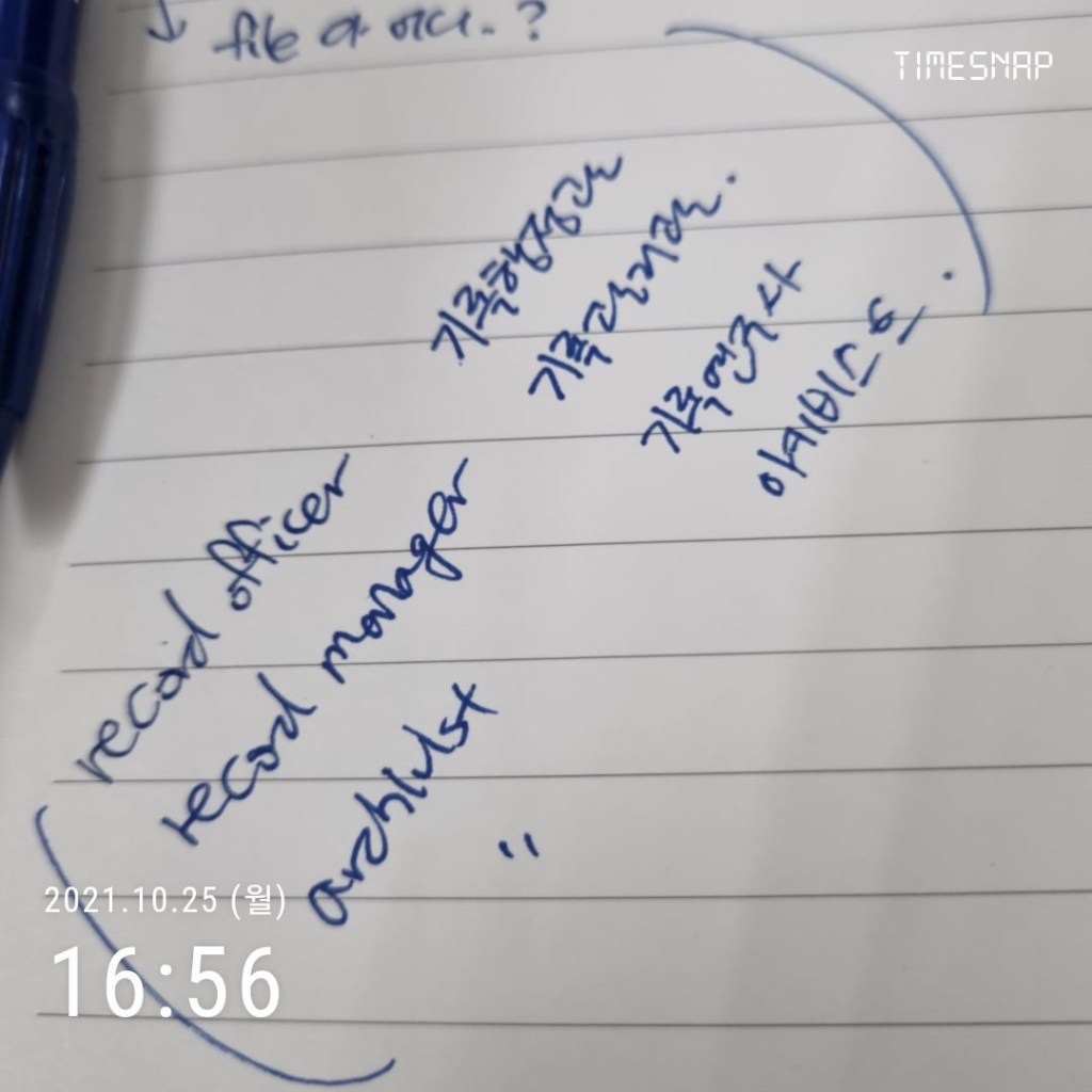 - ‘기록물관리전문요원’: 공공기록물법에서 명시하는 자격 이름이긴 하지만 일단 너무 길다. 그리고 ‘요원’이라니 뭔가 굉장히 비밀스러운 사람이 되어야 할 것 같은 느낌.