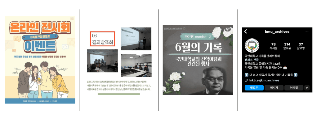 큰 성과가 있다면, 서울기록원에서 ‘아카이브 오픈소스 소프트웨어를 활용한 기록관리 교육 및 컨설팅’이 있었는데 기본반, 심화반 2차례가 있었는데, 여기에 모두 참여하였고, 심화반에서는 1등으로 선정되어 컨설팅을 받기도 했다. 그 때 (주)아카이브랩 안대진 대표님께서 컨설팅을 해주시기도 했다. 컨설팅을 받으면서 오메카를 이용해서 기록위 전용 아카이브 사이트 만드는 것을 제안받아 사이트를 만들어보기도 했고, 온라인 전시까지 진행했다. 전시 주제로 총학생회 선거기록물을 대상으로 했고, ‘기록으로 알아보는 총학생회 선거운동본부 공약변천사’를 제목으로 공약자료집, 포스터 등을 전시했다. 대부분 전자파일로 가지고 있었지만, 비전자로 가지고 있는 것은 서울기록원에 가서 스캔해서 진행했다. 당시 서울기록원이 디지털화에 도움을 주셨다.