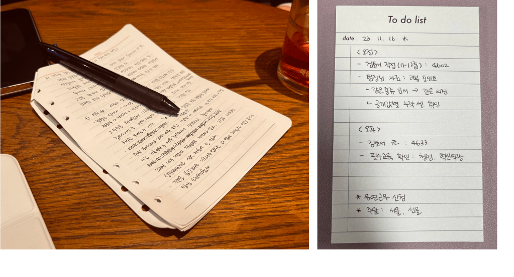 1등으로 출근하는 걸 좋아한다. 불을 켜고, 창문을 열어 환기를 시키고, 스트레칭도 하고. 집에서 가져온 커피도 마시고, 투두 리스트도 쓴다. 오전에 할 일, 오후에 할 일, 확인해야 할 일 등을 적는다.