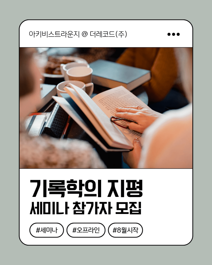 아키비스트라운지에서는 기록학 필독서 세미나 시리즈를 시작해 보려고 합니다. 그 첫 책은 설문원 교수님의 “기록학의 지평”입니다. 상세 내용은 다음과 같습니다.