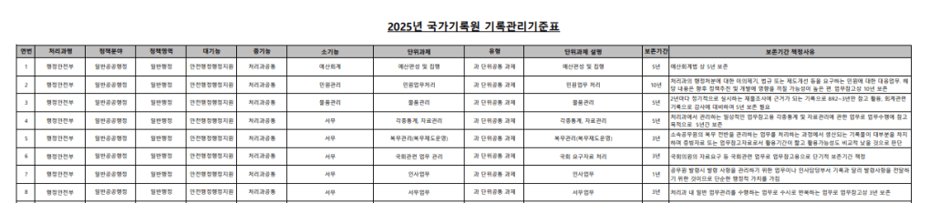 나는 기타공공기관에서만 일해왔기 때문에 BRM과 연계된 기록관리기준표를 직접 운영해본 경험은 없어. 다만 기록관리기준표를 사용하지 않는 기관이라 하더라도 업무 분류를 기반으로 보존기간을 책정한다는 점에서는 구조가 크게 다르지 않아. 눈에 보이는 차이는 대기능-중기능-소기능-단위과제 구조 위에 정책영역과 정책과제가 추가되느냐 정도이니 의미가 있지는 않지. 기록관리기준표든 다른 이름의 보유일정표이든, 결국 현장에서 마주하는 건 시행령이 제시한 관리항목—업무설명, 보존기간 및 책정 사유, 비치기록물 여부, 보존장소, 보존방법, 공개여부, 접근권한—이니까.